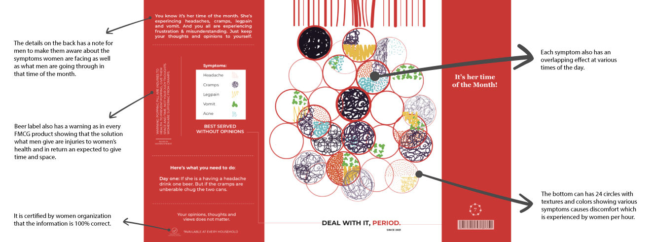 Period is a beer packaging for men from women. This name is conveying put an end to the various common judgments passed by men. The name also suggests a period as a phase or time of the month.